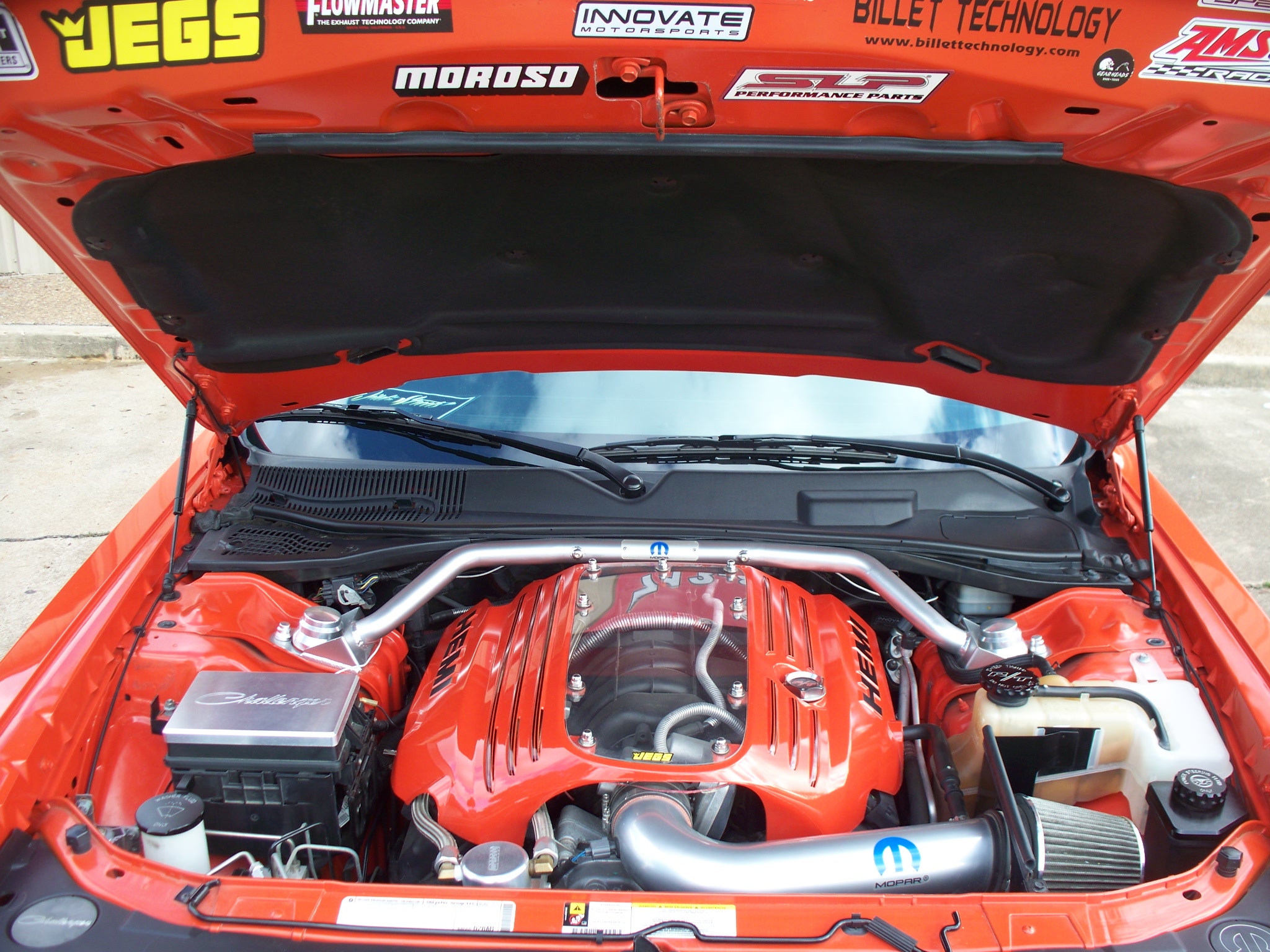 2010 HEMI Challenger; Mopar Cold Air Intake, Mopar Front Strut Brace, Moroso Oil Catch Can, Jet 180 T-Stat, Power Stop Street Warrior Z26 Slotted and Drilled Brakes, Front Brake Lock Kit, Formula 1 Tint on Glass and Sun Roof, SLP Longtube Headers with High Flow Cats, Flowmaster Super 44 Mufflers, Diablo Sport Trinity Tuner, Nitto 555R2 275/40/20 Rear Tires, Innovate AFR Gauge, Hurst 6 Speed Shifter, Hurst Roll Control Kit, Hop Not Kit, Lowered with Eibach Springs, Billet Engine Dress-Up Kit